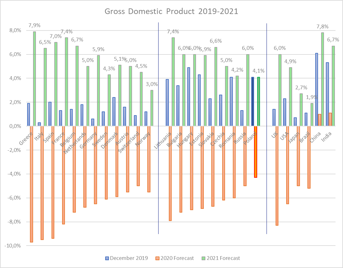 Let’s take a look at Poland on the world map. It is clear from the forecasts that Poland will see the smallest drop in GDP in Eastern Europe (-4.3%). None of the Central European countries will boast such a small drop. Therefore, we have reasons for optimism. A great crisis awaits Great Britain (-8.3%) and the European countries that have been most severely affected by COVID-19: Italy (-9.5%), Spain (-9.4%), France (-8.2%) or Greece trying to rebuild its economy (-9.7%). A large part of these countries will be severely affected by the economic downturn due, among others, to travel bans.