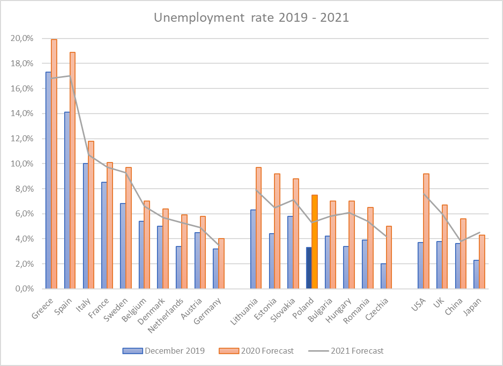 The direct impact on the labor market is a drop in demand as a result of the stagnation of household spending, which is the result of the introduced restrictions and the general uncertainty caused by COVID-19. What does this mean for the labor market, which has been merciless to employers in recent years? A reversal of the situation, to some extent. Of course, this will not be felt in the same way in every industry. Certain groups of specialists will still be sought after on the labor market, although the financial expectations of candidates may be verified. Services will be the worst. Retail, which we read about, is already suffering, and is closing up to 30% of its stores in shopping malls. The level of unemployment at the end of 2021 will increase from 3.3% to 7.5%. The fact is that we are starting from a very low unemployment rate. In 2019, the unemployment rate in Poland was one of the lowest in Europe, next to such economies as: Germany (3.2%) and the Czech Republic (2.0%) and non-European Japan (2.3%). A comparable result was also visible in: Hungary, the Netherlands and Malta (3.4%). The graph compares data data by region: Central Europe, Eastern Europe and selected countries outside Europe, including the UK.